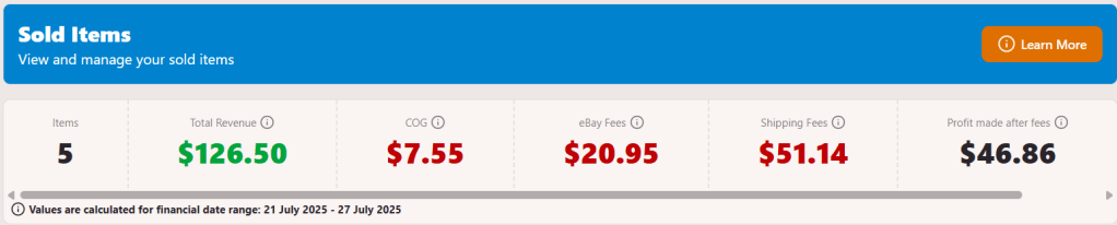 There is still a couple more days left in July, but this is not shaping up to be a great start to the new financial year. I have spent a bit of time rewording some titles of old listings that weren’t getting any views and I also, for the first time ever have upped my promotion percentage on a couple of those older listings, which did end up working out as one of the first ever items I listed sold on Sunday.